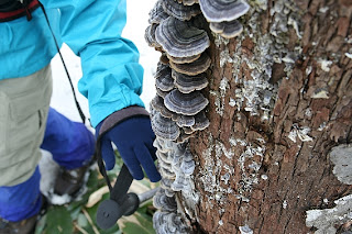 登山道上に雪が現れるのは20分ほども歩いてから。雪の上に出るとなんとなくホッとします。スノーシューはまだ背負ったまま。